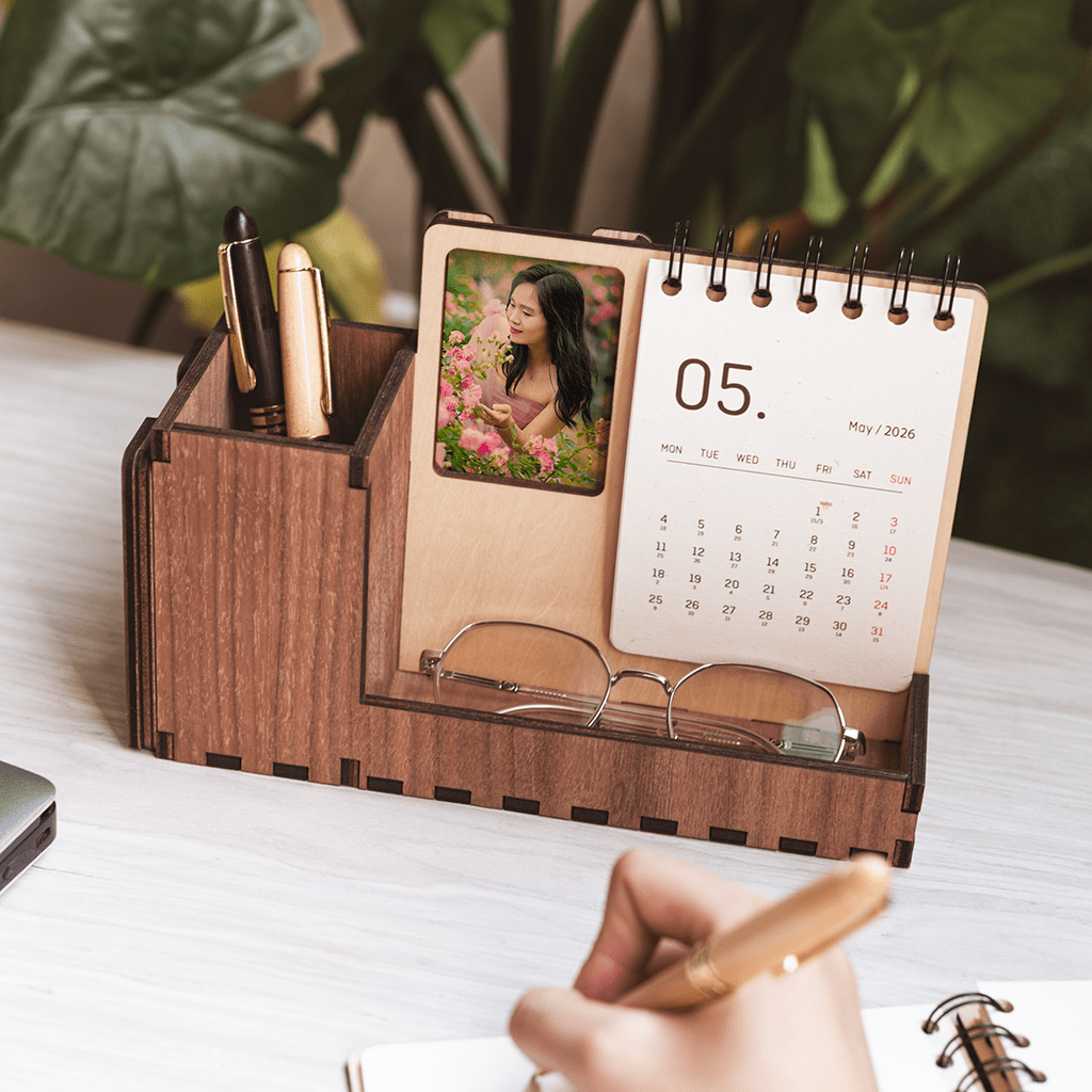 Lấy cảm hứng từ chiếc khung ảnh quen thuộc, tạo nên thiết kế kết hợp lịch và hình ảnh cá nhân. Giúp bạn theo dõi ngày tháng một cách thuận tiện, sản phẩm còn tạo nên một “góc ký ức” ấm áp ngay trên bàn làm việc, tựa như kỷ niệm và thời gian lặng lẽ song hành.